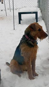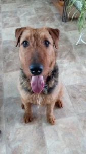 Hi! My name is Lola and I am looking for my new family. I am tall and am what they call a redline Airedale. I don’t have all that fluff on my legs and face and my coat is hard and wiry. I am very bouncy and that is because I have lots of energy to burn off. A fenced yard to run and play in would be great. Some call me goofy, too. I am very affectionate with people and I love my car rides.